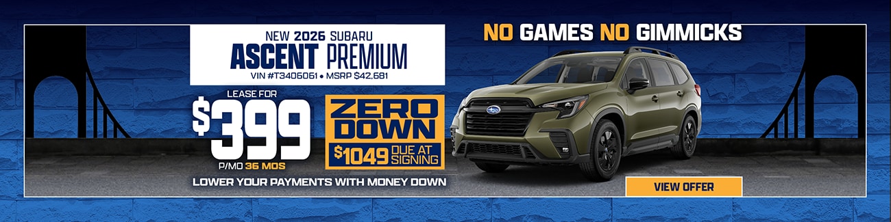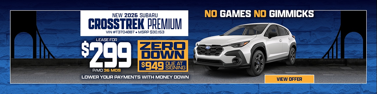 All Prices exclude tax, license, & registration fees. All offers are available to well-qualified applicants with Tier 1 credit. Cannot be combined with any other incentive. Subject to credit approval, vehicle insurance approval, and vehicle availability. Bay Ridge Subaru is not resp for type errors/omissions & photos are for illustration only. Advertised Lease deals thru 3/31/26.